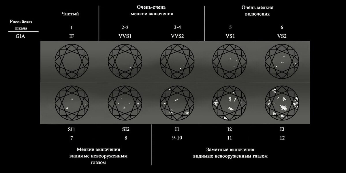 Шкала Цвета бриллианта (Российская/GIA) Шкала Чистоты бриллианта (Российская/GIA)